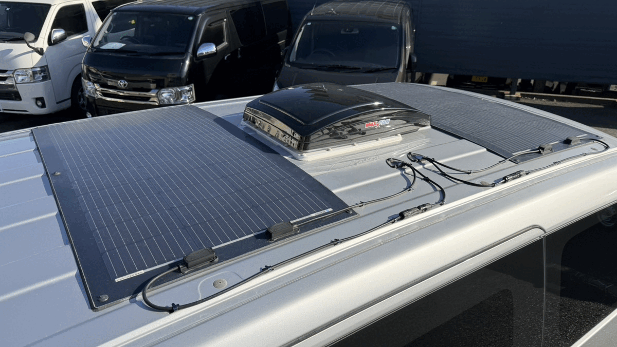 RENOGYフレキシブルソーラーパネルで停車時でも充電可能です。天候によって車両を使わない時でも充電可能です。災害時の電力確保にも役立ちます。※MAXファンと同時装着の場合は100W×2 合計200Wとなります。